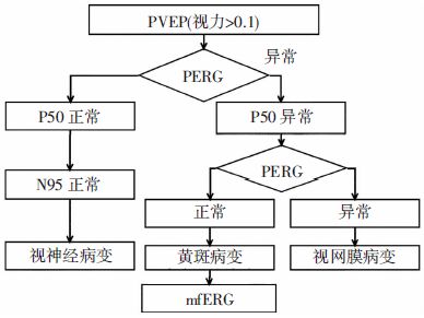 | 图 2 视力>0.1患者的视觉电生理检查流程和判读 |