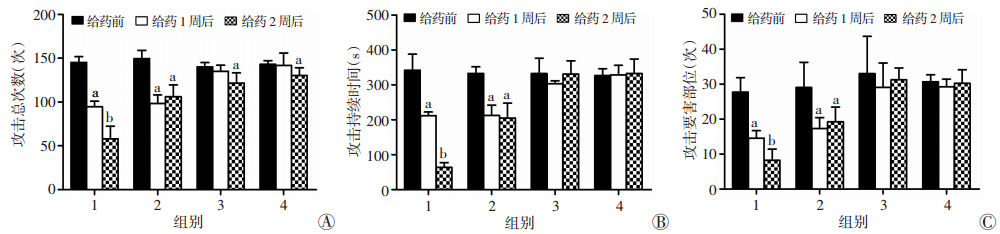 1.5 行为学检测实验过程中共需进行3次行为学测试,分别于给药前,给药1周后及给药2周后。利用居住-入侵实验测试大鼠的攻击行为。将居住鼠的笼子搬至黑暗环境中,并用摄像机记录放入入侵鼠后10 min的大鼠行为。实验结束后,由2名经过一致性培训的实验人员对行为学视频进行评估和记录,并取平均值进行统计。大鼠攻击行为表现为:①攻击总次数(撕咬+攀压+击打);②攻击行为持续时间;③攻击性追逐行为;④攻击性理毛。