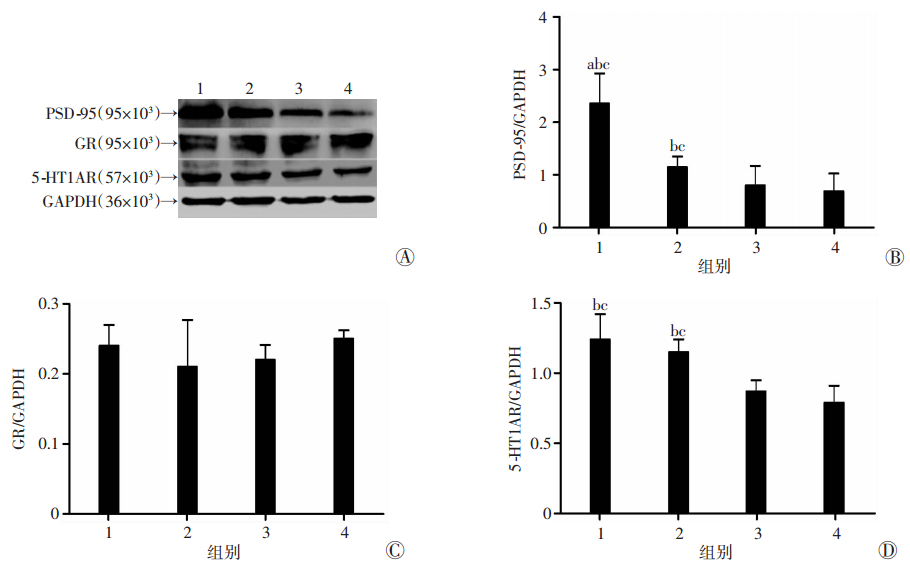 A:各组大鼠海马PSD-95、GR、5-HT1AR蛋白表达结果;B~D:PSD-95、GR、5-HT1AR蛋白相对表达量;1:8-OH-DPAT组;2:8-OH-DPAT+ZL006组;3:ZL006组;4:NaCl组 a:P < 0.05,与8-OH-DPAT+ZL006组比较;b:P < 0.05,与ZL006组比较;c:P < 0.05,与NaCl组比较 图 3 Western blot检测各组大鼠海马PSD-95、GR、5-HT1AR表达 |