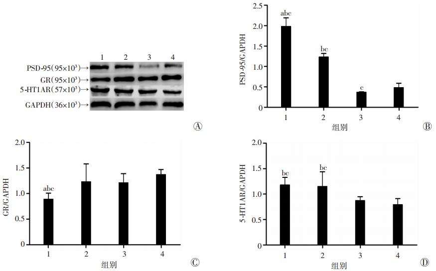1.7 Western blot检测脑区5-HT1AR、PSD-95、糖皮质激素受体(glucocorticoid receptor, GR)蛋白表达水平将脑组织进行裂解、匀浆后取上清液。蛋白定量后进行聚丙烯酰胺凝胶恒压(60~120 V)电泳,恒流250 mA电转膜后封闭PVDF膜2 h(5%脱脂奶粉)后予5-HT1AR(1 :500)、PSD-95(1 :500)及GR(1 :500)抗体孵育,4 ℃过夜。分别予以山羊抗小鼠、抗兔二抗37 ℃烤箱1 h,TBST洗膜3次后用凝胶成像系统显影并分析结果。