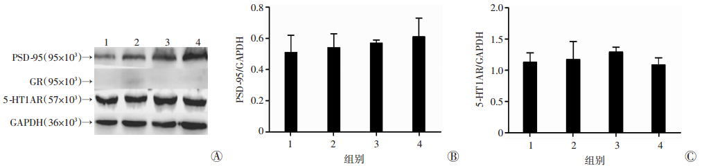 Western blot检测结果显示4组大鼠下丘脑PSD-95、5-HT1AR表达差异无统计学意义(P>0.05),且在该脑区没有清晰检测到GR表达(图 4)。