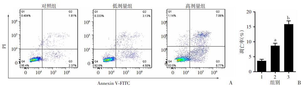 1:对照组;2:低剂量组;3:高剂量组 A:流式细胞检测结果;B:各组凋亡率统计分析 a: P < 0.05,b: P < 0.01,与对照组比较 图 1 流式细胞检测VPA促进SH-SY5Y细胞凋亡 |