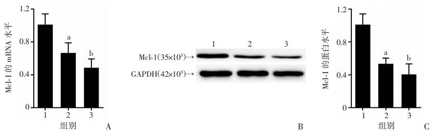 1.5 Western blot检测细胞处理结束后,在冰上用RIPA溶液裂解15 min。于4 ℃、12 000 r/min离心10 min。然后取上清,将蛋白定量后行电泳分析,上样量为每孔总蛋白40 μg。电泳结束后,用半干转法将蛋白从凝胶中转移至PVDF膜上,在室温用5%脱脂奶粉封闭2 h, 再分别用Mcl-1 (1 :1 000稀释)与GAPDH抗体(1 :5 000稀释)4 ℃孵育过夜,PBST洗膜3次,每次5 min,然后分别用山羊抗兔二抗(1 :10 000稀释)在室温孵育1 h,最后经PBST洗膜后再用化学发光法显影曝光。