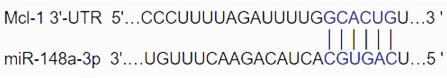 | 图 4 序列对比分析发现Mcl-1 mRNA的3′-UTR区与miR-148a-3p存在互补 |