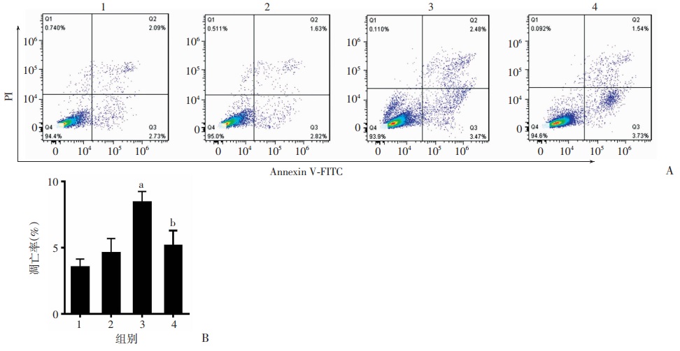 | A:流式细胞仪检测细胞凋亡水平; B:半定量分析 1:对照组; 2 :miR-148a-3p抑制剂组; 3:VPA单独处理组(0.3 mmol/L); 4:miR-148a-3p抑制剂联合VPA处理组; a: P < 0.05, 与对照组比较; b:P < 0.01, 与VPA单独处理组比较 图 7 抑制miR-148a-3p减轻VPA对SH-SY5Y细胞凋亡的诱导效果 |