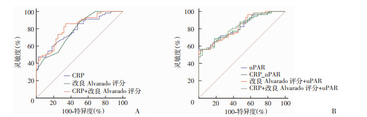 | A:CRP、改良Alvarado评分及两者联合;B:联合uPAR 图 2 各指标单独及联合uPAR的ROC曲线 |