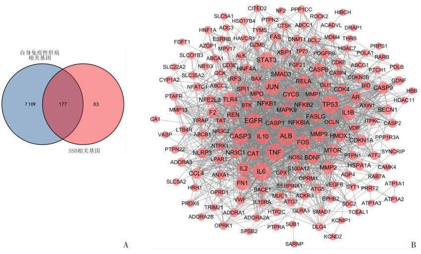 | A: 柴胡皂苷D与自身免疫性肝病潜在靶点的Venn图; B: 潜在靶点的蛋白相互作用网络图 图 1 柴胡皂苷D与自身免疫性肝病潜在靶点的Venn图和蛋白相互作用网络图 |