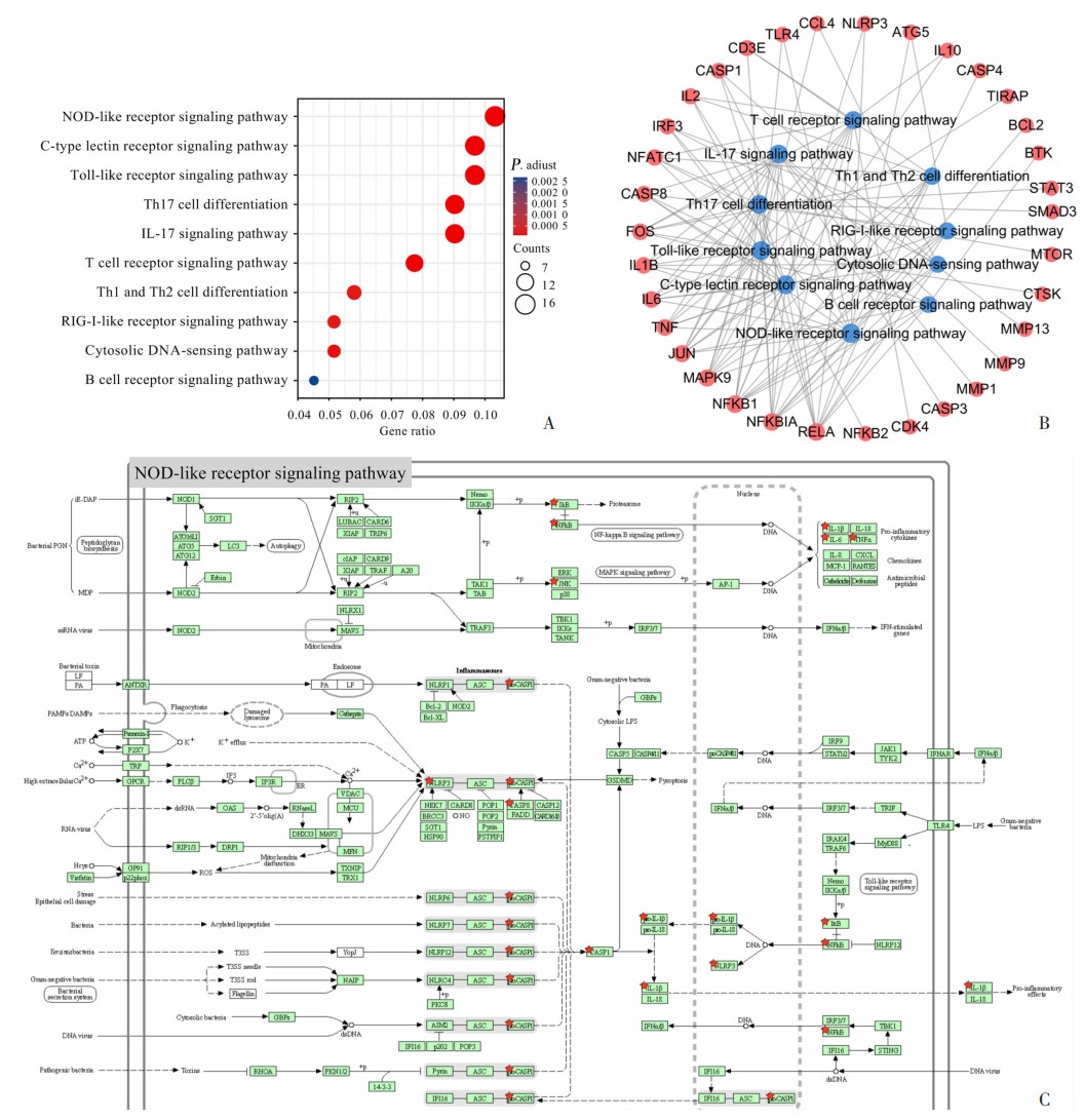 | A: 免疫系统相关KEGG通路富集分析; B: 通路-靶点网络图; C: NOD样受体信号通路, 潜在靶点用红星标注 图 2 SSD与自身免疫性肝病潜在靶点的信号通路分析 |