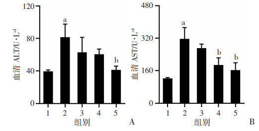 a: P < 0.05,与正常对照组比较;b: P < 0.05,与模型组比较 1:正常对照组;2:模型组;3:SSD低剂量(0.75 mg/kg)组;4:SSD中剂量(1.50 mg/kg)组;5:SSD高剂量(3.00 mg/kg)组 图 3 柴胡皂苷D对免疫性肝纤维化大鼠肝功能的影响(n=8,x±s) |