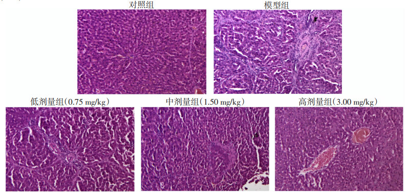 | 图 4 柴胡皂苷D对免疫性肝纤维化大鼠肝脏组织形态学的影响(HE ×100) |