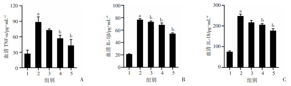| A:TNF-α;B:IL-1β;C:IL-18 1:正常对照组;2:模型组;3:SSD低剂量(0.75 mg/kg)组;4:SSD中剂量(1.50 mg/kg)组;5:SSD高剂量(3.00 mg/kg)组 a: P < 0.05,与正常对照组比较;b: P < 0.05,与模型组比较 图 5 柴胡皂苷D对免疫性肝纤维化大鼠炎症因子的影响(n=8,x±s) |