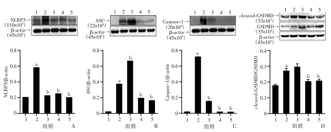 | A:NLRP3;B:ASC;C:Caspase-1;D:GSDMD 1:正常对照组;2:模型组;3:SSD低剂量(0.75 mg/kg)组;4:SSD中剂量(1.50 mg/kg)组;5:SSD高剂量(3.00 mg/kg)组 a: P < 0.05,与正常对照组比较;b: P < 0.05,与模型组比较 图 6 柴胡皂苷D对免疫性肝纤维化大鼠肝脏组织中NLRP3炎症小体和细胞焦亡蛋白的影响(n=8,x±s) |