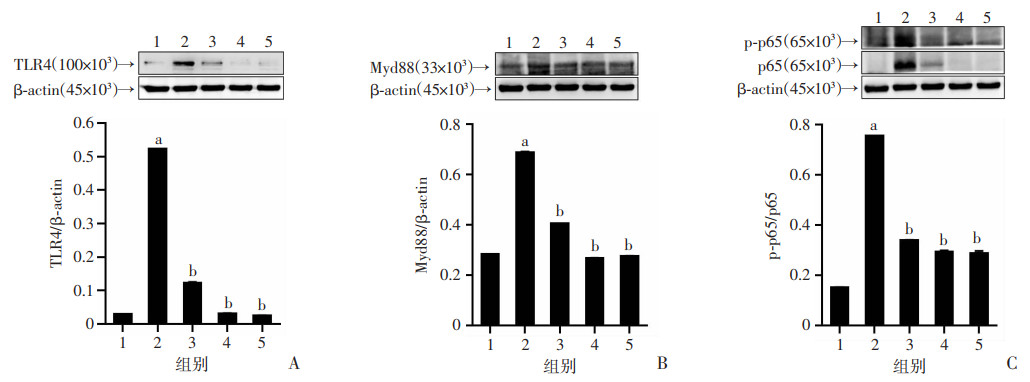 | A:TLR4;B:Myd88;C:p65 1:正常对照组;2:模型组;3:SSD低剂量(0.75 mg/kg)组;4:SSD中剂量(1.50 mg/kg)组;5:SSD高剂量(3.00 mg/kg)组 a: P < 0.05,与正常对照组比较;b: P < 0.05,与模型组比较 图 7 柴胡皂苷D对免疫性肝纤维化大鼠肝脏组织中TLR4/Myd88/NF-κB信号通路的影响(n=8,x±s) |
