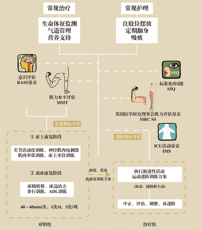 2组患者均给予常规治疗(包括生命体征监测、气道管理、营养支持等)和常规护理(包括良肢位摆放、定期翻身、吸痰等),在此基础上,2组患者根据评估结果执行相应的康复方案,康复训练中密切注意患者主观感受和生命体征,按照既定的中止指标适时中止,安全开展, 见图 1。