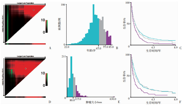 图 1 X-tile软件分析年龄(A~C)及肿瘤大小(D~F)的最佳截断值 |
