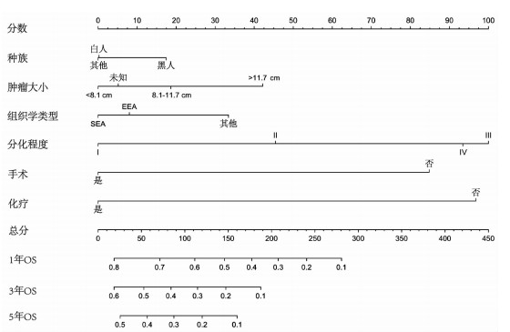 在单因素分析中,年龄、种族、婚姻状态、肿瘤大小、肿瘤分级、组织学类型、手术、淋巴结切除和化疗与远处转移性EC患者预后相关;将P<0.05的所有变量纳入多因素Cox回归模型中,结果显示,其他种族人群(HR=0.879)、肿瘤> 11.7 cm(HR=1.459)、其他组织学亚型(HR=1.260)、肿瘤分级Ⅳ级(HR=2.288)、手术治疗(HR=0.480)和化疗(HR=0.423)为患者OS的独立影响因素(P<0.05,表 2)。