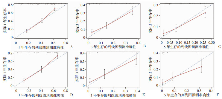 A~C:训练队列中,远处转移性EC患者1、3、5年总生存率的校准曲线;D~F:内部验证队列中,远处转移性EC患者1、3、5年总生存率的校准曲线 图 4 列线图模型的校准曲线 |