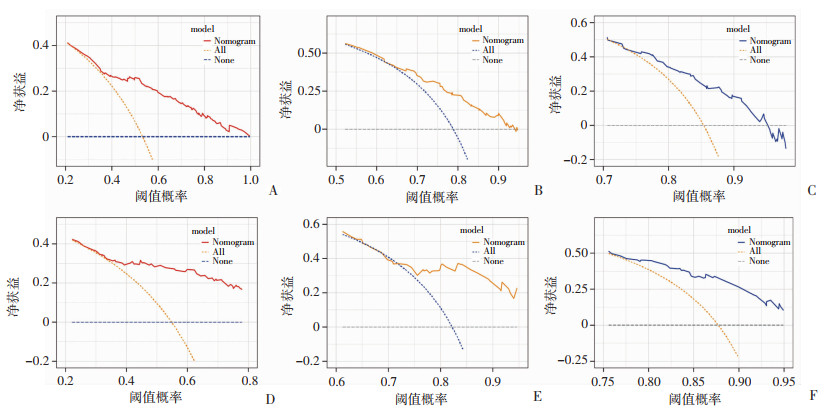 A~C:训练队列中,预测远处转移性EC患者1、3、5年生存模型的DCA曲线;D~F:内部验证队列中,预测远处转移性EC患者1、3、5年生存模型的DCA曲线 图 5 列线图模型的临床决策曲线 |