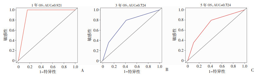A~C:OS列线图在外部验证队列中预测远处转移性EC患者1、3、5年总生存率的ROC曲线及AUC值 图 6 外部验证组患者ROC曲线及AUC值 |