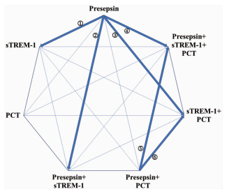 蓝色实线:示两组间没有统计学差异;蓝色长箭:示两组间有统计学差异,且箭头指向的组别诊断价值更高;①sTREM-1对脓毒症的诊断价值优于Presepsin;②Presepsin+sTREM-1对脓毒症的诊断价值优于Presepsin;③sTREM-1+PCT对脓毒症的诊断价值优于Presepsin;④Presepsin+sTREM-1+PCT对脓毒症的诊断价值优于Presepsin;⑤Presepsin+sTREM-1+PCT对脓毒症的诊断价值优于Presepsin+PCT;⑥sTREM-1+PCT对脓毒症的诊断价值优于Presepsin+PCT 图 2 三种指标及联合指标(d1)对脓毒症早期诊断价值的两两比较 |