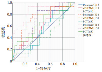 1.3 方法及试剂分别于入院第1天(d1)、第3天(d3)、第5天(d5)用抗凝管采集患者清晨空腹外周静脉血6 mL,3 000 r/min离心15 min,分离血清,放置于-80 ℃冰箱保存待测。采用微粒子酶联免疫分析法检测血清PCT水平,血清Presepsin水平测定使用日本LSI Medience公司PATHFAST化学发光免疫测定分析仪及配套试剂。采用化学发光免疫分析法测定血清sTREM-1水平,sTREM-1检测试剂盒购自荷兰Hycult Biotech公司,使用深圳迈瑞CL -2000i全自动化学发光免疫分析仪测定吸光度。