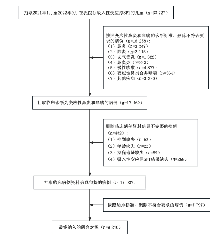 1 资料与方法 1.1 研究对象采用横断面研究设计方案,收集2021年1月至2022年9月在我院呼吸科门诊行吸入性变应原SPT的9 240例AR和哮喘的病例资料。本研究获得重庆医科大学附属儿童医院伦理委员会批准(202317)。AR和哮喘的诊断均符合《儿童变应性鼻炎诊断和治疗指南(2010重庆)》 [7]和《儿童支气管哮喘诊断和防治指南(2016)》[8]的诊断标准。纳入标准:临床诊断为变应性鼻炎和哮喘的0~14岁儿童。排除标准:①临床病历资料不完整者(临床病历资料包括患儿姓名、ID、性别、年龄、就诊时间、疾病诊断、家庭住址、吸入性变应原SPT结果);②检测前3 d内口服抗组胺药及全身使用糖皮质激素者;③检测前1 d点刺部位使用过糖皮质激素者;④严重过敏反应急性发作期或既往发生过过敏性休克者;⑤重度哮喘急性发作期者;⑥严重湿疹、荨麻疹、瘢痕、局部皮肤色素沉着者。研究对象筛选流程见图 1。