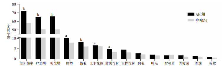 a: P < 0.05, b: P < 0.01,与哮喘组比较 图 2 AR和哮喘患儿各吸入性变应原SPT阳性检出率分布情况 |
