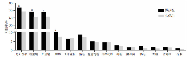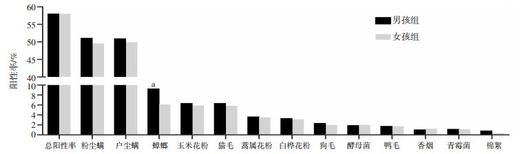a: P < 0.05, 与女孩组比较 图 3 AR患儿不同性别吸入性变应原SPT阳性检出率分布情况 |