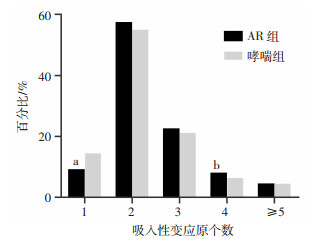 a: P < 0.01, b: P < 0.05, 与哮喘组比较 图 5 AR和哮喘患儿吸入性变应原SPT阳性个数分布比较 |