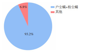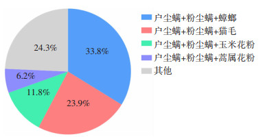 进一步分析显示:户尘螨(χ2=144.12,P < 0.001)、粉尘螨(χ2=153.09,P < 0.001)、蟑螂(χ2=11.40,P=0.001)、猫毛(χ2=13.89,P < 0.001)、白桦花粉(χ2= 8.48,P=0.004)和蒿属花粉(χ2=8.29,P=0.004)的阳性检出率在疾病组间差异具有统计学意义(P < 0.05)。其他吸入性变应原阳性检出率在疾病组间不存在明显差异。