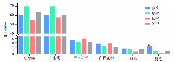 a: P < 0.05,与秋季组相比,b: P < 0.001,与秋季组相比 图 8 AR患儿吸入性变应原SPT阳性检出率在四季的分布情况 |