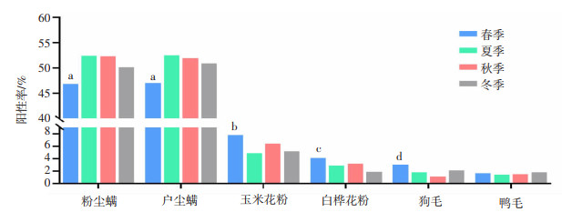 哮喘组中,粉尘螨和户尘螨的阳性检出率在夏季最高,春季最低(χ2=15.55,P=0.001;χ2=12.17,P= 0.004);玉米花粉的阳性检出率在春季最高,夏季最低(χ2=18.39,P < 0.001);白桦花粉阳性检出率在春季最高,冬季最低(χ2=12.82,P=0.005);狗毛的阳性检出率在春季最高,随着季节的更替逐渐下降,但在冬季又再次上升(χ2=14.82,P=0.002)。其余吸入性变应原的阳性检出率在各季节间差异无统计学意义,见图 9。