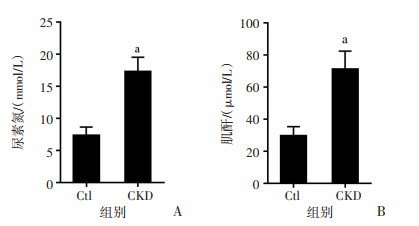 a:P < 0.05,与Ctl组比较 图 1 5/6肾切除术诱导慢性肾病后大鼠尿素氮(A)及肌酐(B)检测结果(x±s,n=6) |