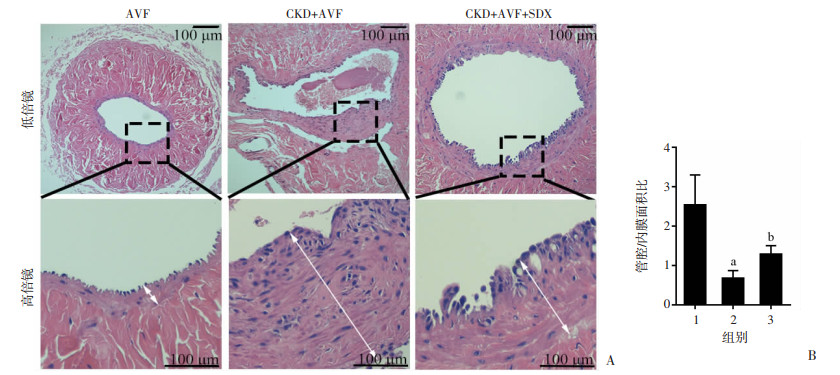 CKD建模成功后,对各组大鼠进行AVF手术,术后进行SDX灌胃,2个月后检测血管新生内膜厚度。HE染色结果显示CKD+AVF组血管新生内膜较AVF组明显增厚,管腔与内膜面积比降低(P < 0.05);在SDX灌胃处理后,与CKD+AVF组相比,CKD+AVF+SDX组血管新生内膜增厚程度减轻,管腔与内膜面积比有明显提升(图 2)。