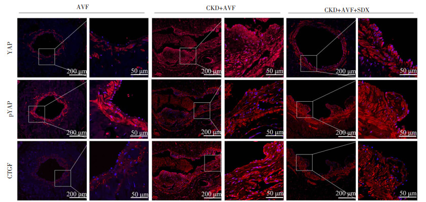 AVF:正常大鼠进行AVF手术;CKD+AVF:大鼠经诱导慢性肾病后进行AVF手术+生理盐水灌胃2月;CKD+AVF+SDX:大鼠经诱导慢性肾病后进行AVF手术+8 mg/(kg·d)SDX灌胃2月。 图 3 免疫荧光检测大鼠AVF瘘口YAP和CTGF的表达 |