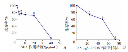 为了进一步探讨舒洛地特的作用机制,本研究培养了人内皮细胞株EAHy926细胞,首先以不同浓度的SDX(0、2.5、5、10、20、40 μg/mL)处理细胞,检测细胞存活率。CCK-8检测结果显示,在SDX处理24 h后,随着SDX浓度的增加,细胞存活率逐渐降低。与0 μg/mL相比,舒洛地特浓度为2.5 μg/mL时,细胞存活率降到80%(P < 0.05,图 4A),在2.5~20 μg/mL浓度之间,细胞存活率无明显变化,直到40 μg/mL的浓度才出现明显抑制。进一步检测2.5 μg/mL SDX处理后24、48、72 h的细胞存活率,结果发现随SDX处理时间增加,EAHy926细胞存活率也随之降低。与0 h处理组相比,72 h组EAHy926细胞存活率受到显著抑制(P < 0.05,图 4B)。因此,为保证SDX处理效果,后续实验选择细胞存活率为80%时2.5 μg/mL舒洛地特处理24 h。