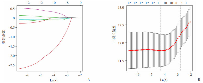 | A:LASSO回归变量变异系数与Ln(λ)的关系曲线图;B:LASSO回归二项式偏差与Ln(λ)的关系曲线图 图 1 Lasso-Cox回归对CKD患者全因死亡的风险因子筛选图 |